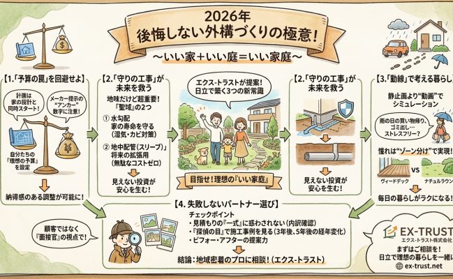 ハウスメーカーの提携業者は安心感がありますが、中間マージンが発生したり、選べる素材に制限があったりすることもあります。エクス-トラストのような「地域密着の専門業者」に直接相談することで、より自由度が高く、かつコストパフォーマンスに優れた提案が可能になります。