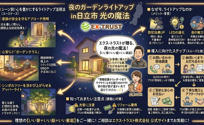 「最後まで読むと、日立市での夜の庭づくりの魅力から、具体的なライトアップの手法、そして防犯にも役立つ一石二鳥のアイデアまでがしっかりわかります!」